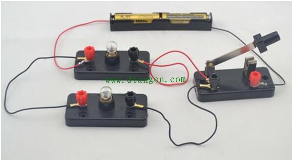 在现实生产、生活中各种电路都是由各种实际电路元件或者设备构成,比如下图所示的电路,该电路是由干电池、开关、灯泡和若干导线构成,符合构成电路三个组成部分(电源、负载和中间环节),干电池作为电源向负载提供电能,灯泡作为负载吸收电能并转化成光能,中间环节是由导线和开关构成起到控制通断电路和导通电能的作用。这些干电池、灯泡、开关还有导线它们都是现实中的元件,这些原件在工作时会出现的电磁现象不是单一的。比如灯泡通电时它不仅会发热,也会产生微弱的磁场;线圈通电时不仅会产生磁场,线圈也会发热;导线总是会存在一定的电阻。所以实际电路是多种电磁现象交织在一起。但是我们为了研究问题方便,抓住主要矛盾忽略次要矛盾,将实际电气元件用单一的电磁性质的理想化元件来表示。