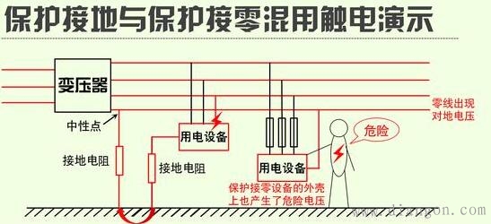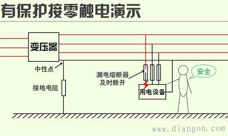 (2)保护接零:适用于中性点接地的三相电源系统中(一些民用三相四线中性点接地系统也采用保护接地,但必须是配合带有漏电保护的开关使用)。