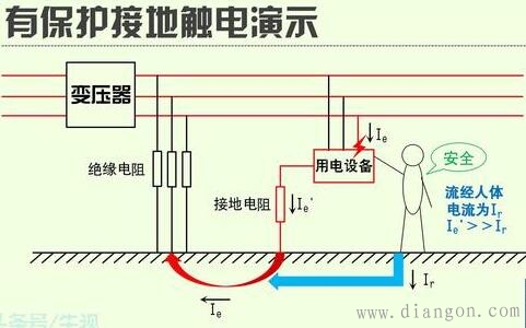 (1)保护接地:电气设备的导体部分或者外壳用足够容量的金属导线或导体可靠的与大地连接,当人体触及带电外壳时,人体相当于接地电阻的一条并联支路,由于人体电阻远远大于接地电阻,所以通过人体的电流将会很小,避免了人身触电事故。