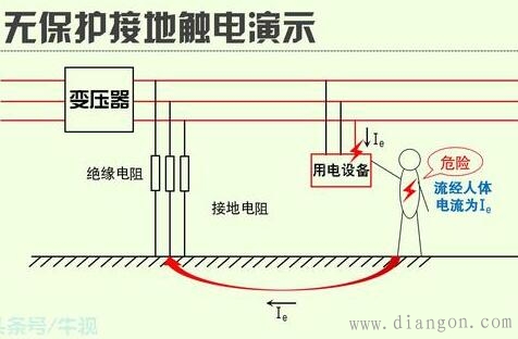 (1)在中性点不接地系统中:当人体触及电气设备的导体部分或者外壳时,人体相当于一个与接地电阻并联支路的一个大电阻。若按人体电阻值1000Ω(通常人体电阻值为1000~2000Ω)计算,设备外壳所带电压为220V时,那么无保护接地时流经人体的电流为:Ir=220/Rr=220mA(人体可以承受的最大交流电流/交流摆脱电流为10mA)。