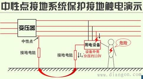 (2)中性点不接地的三相四线制配电系统中,不允许用保护接零,只能用保护接地。系统中任意一相发生接地,整个系统仍照常运行,但大地与接地线等电位,则接在零线上的用电设备外壳对地电压降等于接地的相线从接地点到中性点的电压值,是十分危险的。