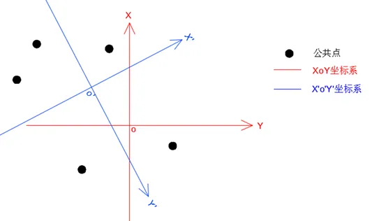 所谓公共点,就是同时拥有两个坐标系坐标的点,这类点在实际工作中很容易获取,可通过现场测量、图纸查询等方式得到。下面我们以两个公共点为例,推导具体的转换公式,满足日常工地的实际应用需求。