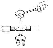 2 )浇焊。对于截面积大于16mm 2的铜芯导线接头,常采用浇焊法。首先将焊锡放在化锡锅内,用喷灯或电炉使其熔化,待表面呈磷黄色时,说明焊锡已经达到高热状态,然后将涂有无酸焊锡膏的导线接头放在锡锅上面,再用勺盛上熔化的锡,从接头上面浇下,