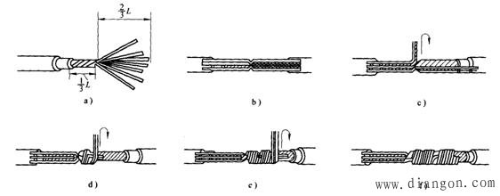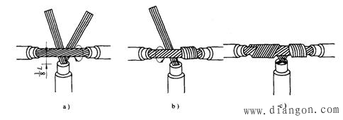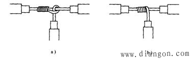 l )如果导线直径较小,可按图2a 所示方法绕制成结状,然后再把支路芯线线头拉紧扳直,紧密地缠绕6-8 圈后,剪去多余芯线,并钳平毛刺。