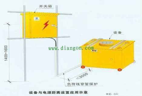 单机开关箱宜采用钢管扣件固定;设备开关箱箱体中心距地面垂直高度为1.5m;设备水平护荷线宜采用PVC管埋地敷设;设备距开关箱水平距离不得大于3m;PVC管直径为负荷线直径的1.5倍;右图适用于施工现场所有固定加工车间的所有固定设备。