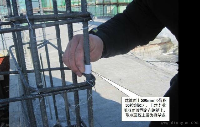 4、用胶带在有线盒旁的钢筋上按照激光抄平点贴标识;