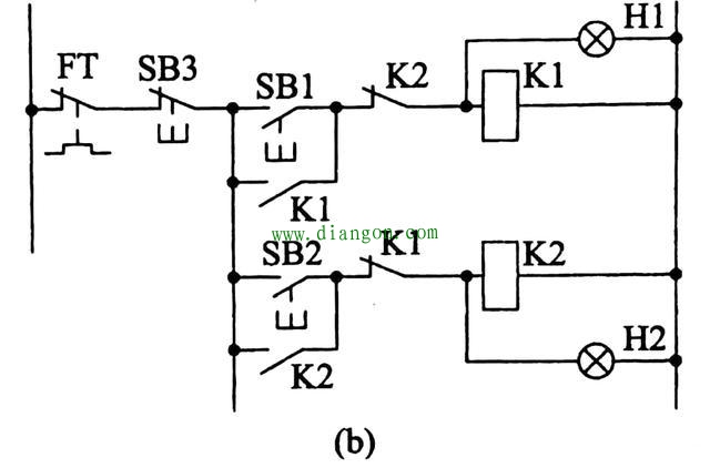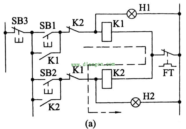 但当热继电器FT动作时,线路就出现了虚线所示的寄生回路,使正向接触器KI不能释放,起不了保护作用。正确的接法应将K1、K2两个线圈接于电源的同端,如图5(b)所示。