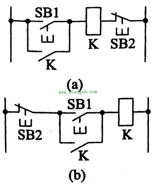 还有就是控制电路为交流220V单相时,线圈没放在N端。这也好理解,和照明电路相似,开关控制火线,负载接零线端。见图4所示。图4(b)为正确的设计。