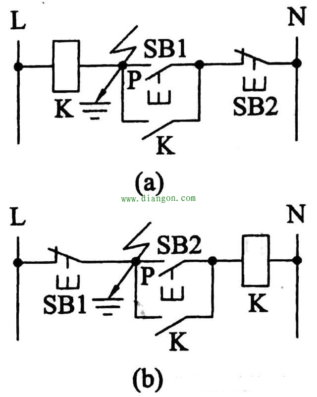 图2所示的接法也是一个道理,虽说SB1和SB2不是一个按钮开关,但两个开关都装在一个开关盒里距离也是很近,处在不同相位上,见图2(a),也有弧光短路的可能。应按图2(b)设计。