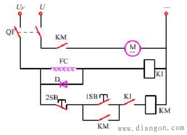 原理:当QF 合上后,直流电动机的励磁绕组首先通电,且当励磁电流上升到额定值时,电流继电器KI 线圈得电,其动合触头合上,才能使接触器KM 线圈具备得电条件。当按下启动按钮后,KM 的线圈得电,其动合触头是电枢通电,电动机开始运转。