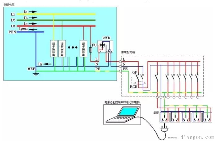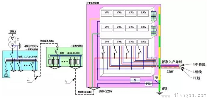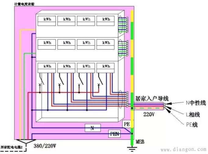 我们看到,N线被引到电度表中,最后与相线和PE线一起,被送往各个居家的入户处。见图中的右下方。