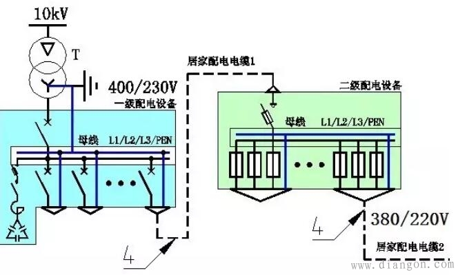 经过一级配电设备和二级配电设备,由于有配电线路的压降,使得二级配电设备输出的电压降低为380V/220V。这个电压被称为标称电压,是所有居家配电和用电电器的工作电压。