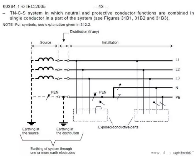 我们来看IEC60364-1中给出的有关TN-C-S的图: