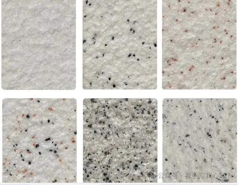 这张照片很好的展现了几种材料,我们都叫做外墙涂料。除了乳胶漆之外,我们把模拟、仿照石材外观的涂料统称为真石漆、仿石漆。