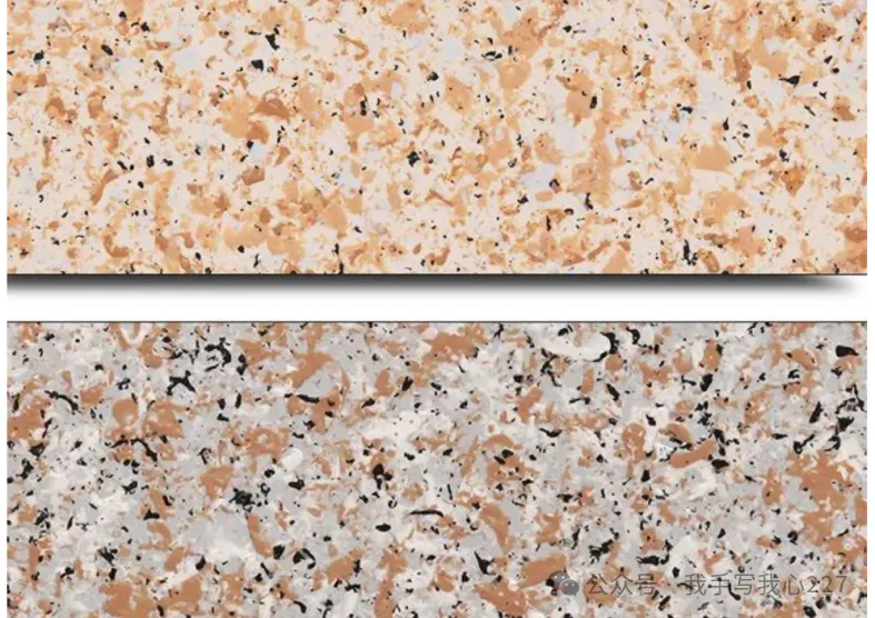 水包水由乳液+彩粒点+助剂组成,因其表面较为光滑多用于模仿大理石,仿石效果十分逼真。但因为其表面光滑,缺乏真石漆的质感,如果想模仿火烧面或荔枝面的石材效果就要使用水包砂了。