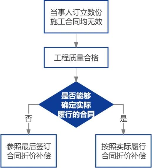 当事人就同一建设工程订立的数份建设工程施工合同均无效,但建设工程质量合格,一方当事人请求参照实际履行的合同关于工程价款的约定折价补偿承包人的,人民法院应予支持。
