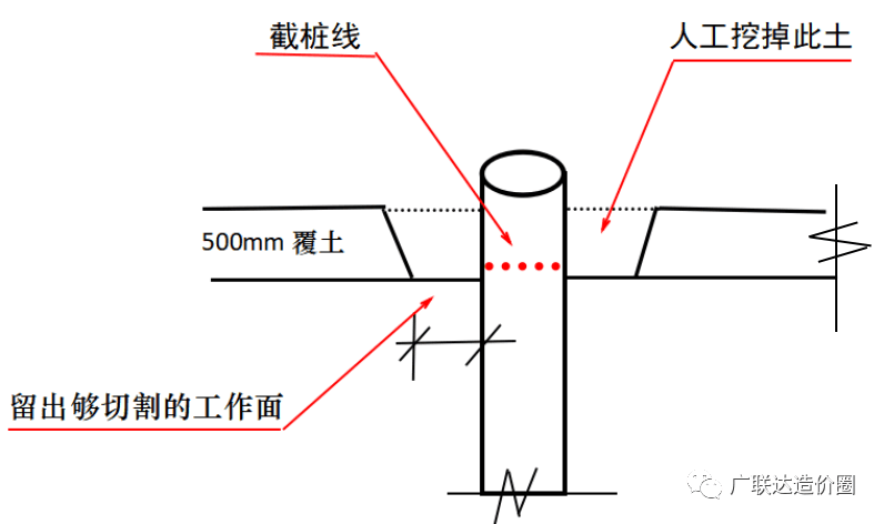 如按审计主楼500mm厚余土不属于桩间土之观点,则桩基单位在桩基结束后,用人工在桩周围挖出能够让切割机展开的工作面,方能切割截桩。这样操作需改变施工流程,做法见图5: