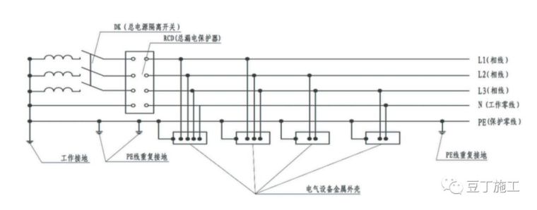 临时用电工程电源中性点直接接地的220/380V低压电力系统必须采用TN-S接零保护系统,即电源端直接接地,电气装置的外露导电部分与配电系统的接地点直接做电气连接(即采用保护接零),中性导体和保护导体分开设置。