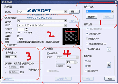 3、如图所示我们看到标注1区域是设置基本样式的,zwcad.ctb是彩色打印,monochrome是黑白打印,标注中的区域2是用来设置打印纸张大小的,根据图像各种需求设置纸张分数,区域3是要根据自己的打印需求在区域3中选择要打印的范围