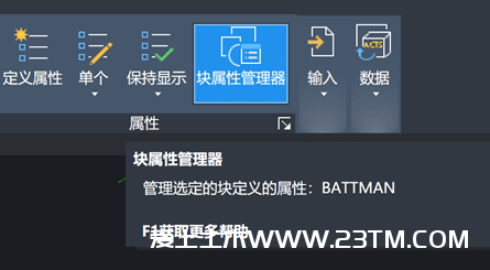 命令介绍:管理当前图形中块的属性定义。可以直接在命令行输入命令执行,也可以在面板功能区: 插入 ? 属性 ? 块属性管理器通过单击图标执行,如图所示。