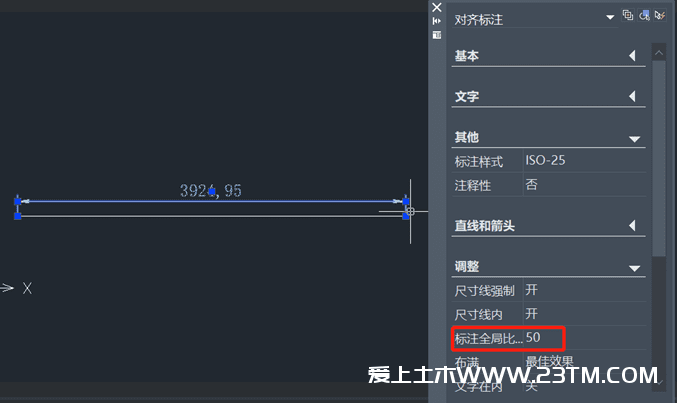 3.此时,通过特性面板发现全局比例并非是默认的1,也非更改过后的100,是50。为什么会出现种情况呢?是因为我们在绘制图形时,比例并非通过【修改标注样式】对话框修改的,它是通过特性面板修改的。