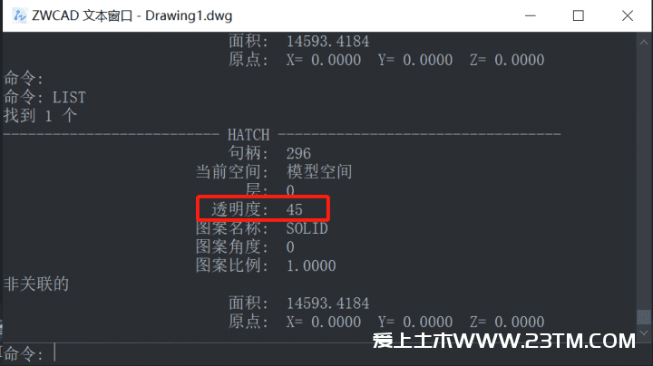LIST 命令列出对象特性中有列出透明度,当选择对象的透明度未设置为“随层”时,支持列出当前对象的透明度设置。或者是通过特性面板(ctrl+1)在内对其更改。